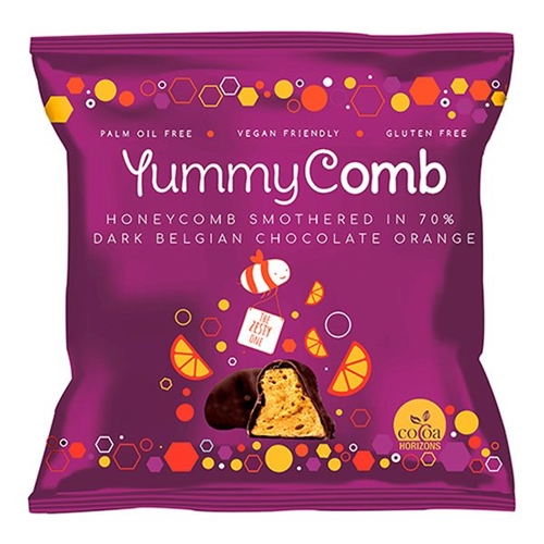 Bits size honeycomb nuggets smothered in 70% Dark Orange Belgian Chocolate. Gluten Free, Vegan friendly, Zero palm oil, 100% Natural flavours.